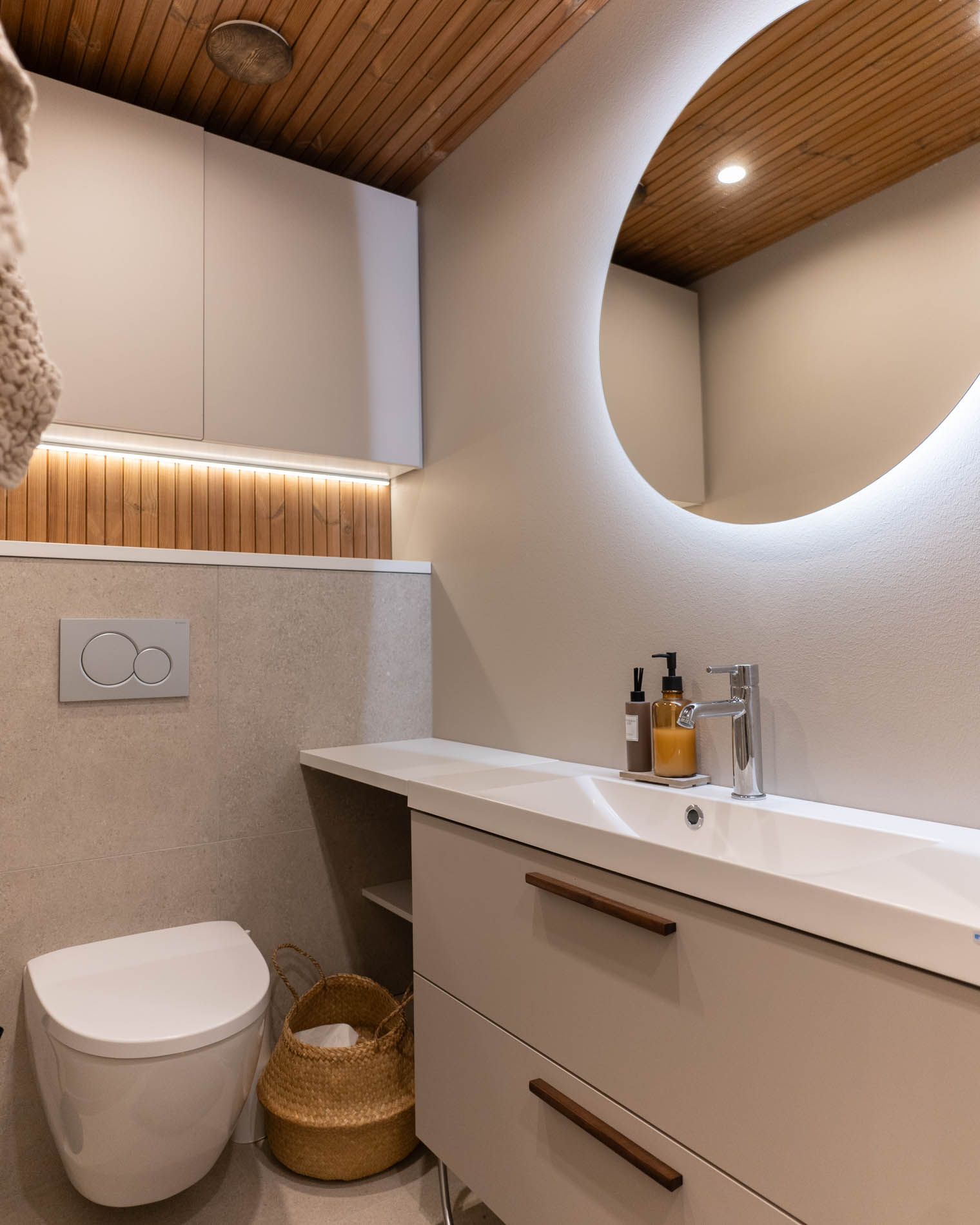 Tämä WC-tila yhdistää modernin minimalismin ja lämpimän luonnonläheisen estetiikan. Kalusteiden ja pintamateriaalien huolellinen valinta tekee tilasta sekä tyylikkään että toimivan – pienuudestaan huolimatta tila on avara, valoisa ja käytännöllinen.